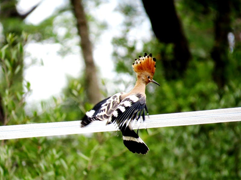 también yendo por unos árboles de eucalipto veo levantar una abubilla y digo que ver seguimos-la; de repente se me para al lomo de mi caballo y yo reparo la cámara pero en ese momento se me puso al hilo pastor y se me puso en unas posiciones debido a que ella pesaba más que el hilo pastor: